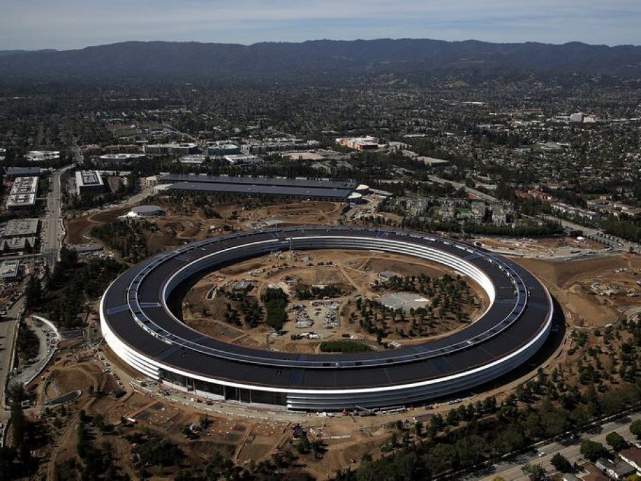 An aerial view of the new Apple headquarters on April 28, 2017, in Cupertino, Calif. Apple's new 175-acre 'spaceship' campus dubbed 'Apple Park', costing roughly $5 billion, will house 13,000 employees in over 2.8 million square feet of office space and will have nearly 80 acres of parking to accommodate 11,000 cars. Justin Sullivan, Getty Images